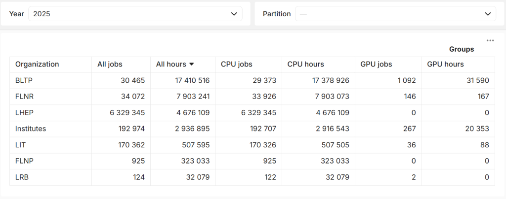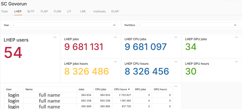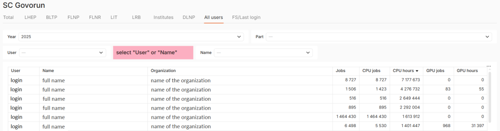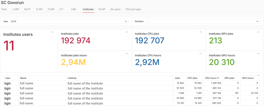 На главной странице (Рис. 1) представлена общая обезличенная статистика использования вычислительных ресурсов суперкомпьютера «Говорун», которая включает данные за всё время накопления статистики и охватывает все группы пользователей. Группы сформированы по месту работы пользователя (лаборатории ОИЯИ), а сотрудники сторонних организаций объединены в группу «Institutes». Для каждой группы предусмотрена отдельная вкладка с подробной информацией: количество пользователей, количество запущенных задач, затраченные ядро-часы, использованные ресурсы и персональные данные каждого участника. В отдельной вкладке представлена сводная таблица со всеми пользователями и их данными.