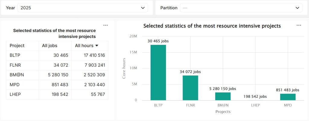Статистика по наиболее ресурсоёмким проектам ОИЯИ, в том числе MPD, BM@N и проектам Лаборатории теоретической физики, представлена в виде таблицы и гистограммы (Рис. 5).