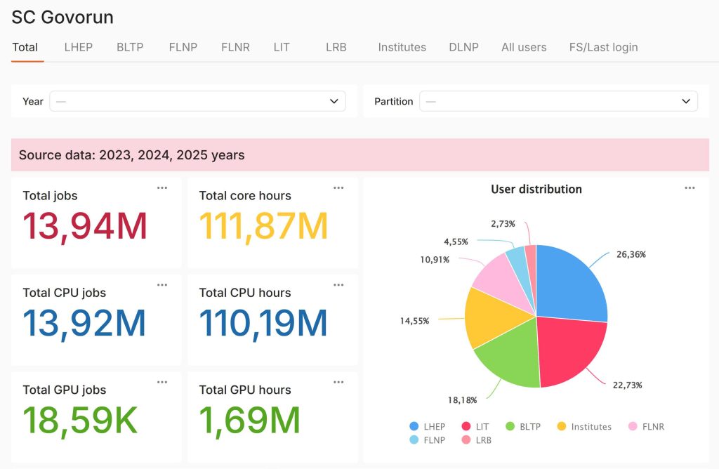 Система аккаунтинга, визуализации и анализа статистики использования вычислительных ресурсов суперкомпьютера «Говорун» позволяет системным администраторам и руководству суперкомпьютера отслеживать использование ресурсов, выявлять тенденции, а также оценивать вклад различных групп пользователей.