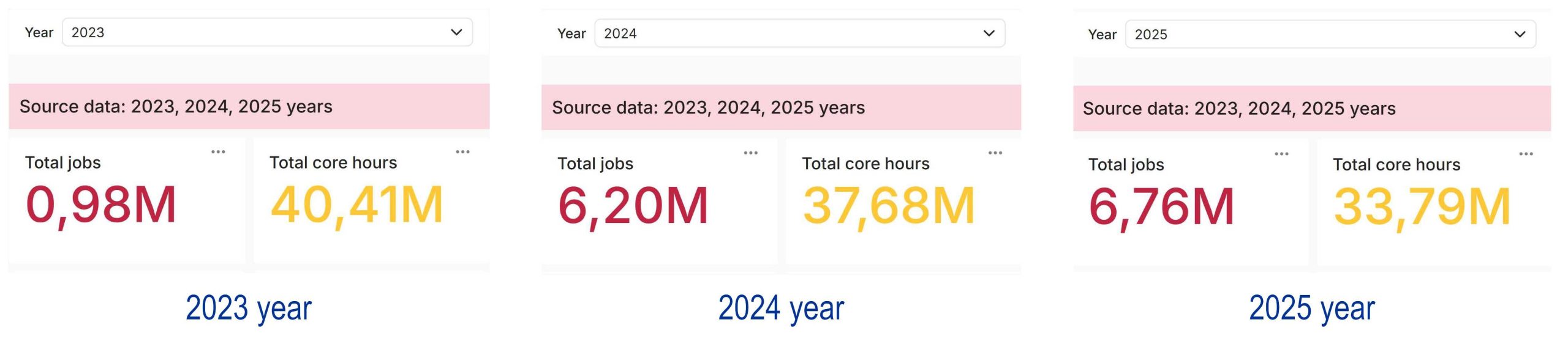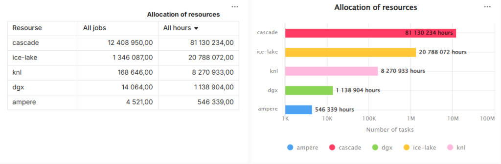Общее количество счётных задач и затраченных CPU ядро-часов и GPU часов для каждой группы, а также количество счётных задач, использующих CPU и GPU ресурсы, и, соответственно, количество затраченного времени по ресурсам, показано в сводной таблице (Рис.4).