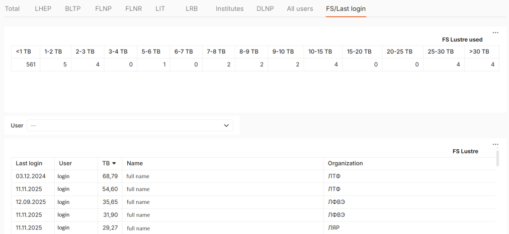 Во вкладке «FS/Last login» представлена информация об использовании системы хранения данных – персональные данные пользователей, дата последнего входа на суперкомпьютер, размер домашних директорий пользователей в терабайтах (TB), размещенных на файловой системе Lustre (Рис. 11).