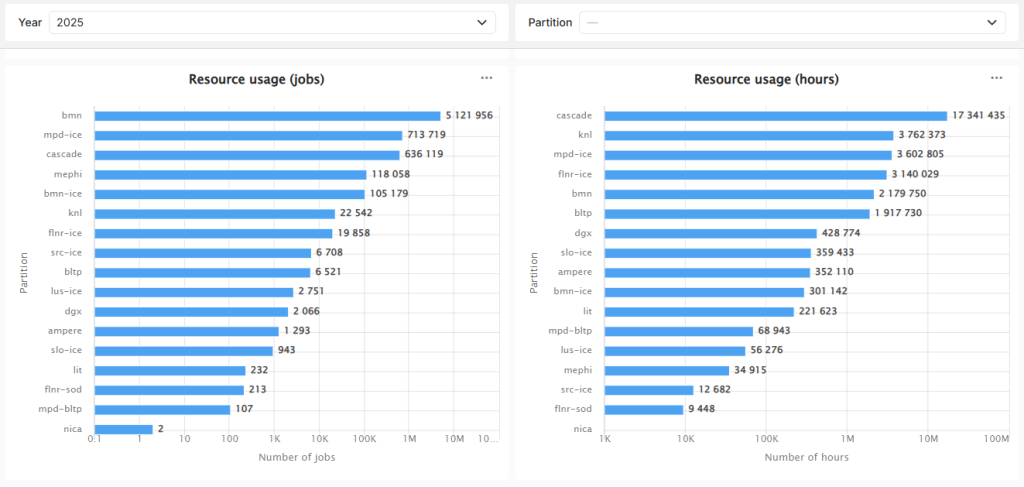 Благодаря интерактивным гистограммам, таблицам и индикаторам можно получить полное представление об использовании вычислительных ресурсов, вкладе отдельных лабораторий и проектов, а также выполнить аккаунтинг работы пользователей суперкомпьютера «Говорун». Система позволяет сортировать данные по различным параметрам, что упрощает анализ и выявление закономерностей.