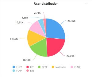 Отображение статистики по группам пользователей включает в себя несколько представлений. Распределение пользователей по лабораториям в процентном соотношении представлено в виде круговой диаграммы (Рис.3), что помогает оценить, насколько востребованы вычислительные ресурсы каждой лабораторией.