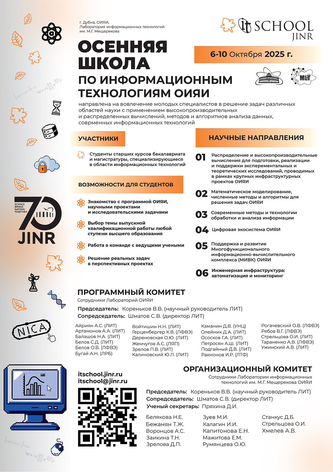 C 6 по 10 октября 2025 г. в конференц-зале ЛИТ будет проходить Осенняя Школа по информационным технологиям ОИЯИ, которая нацелена на знакомство студентов с ОИЯИ и его задачами. Будет много интересных лекций! Приходите или подключайтесь дистанционно. Трансляция Школы будет проводиться ежедневно, ссылка действительна всю неделю. С программой школы можно ознакомиться по ссылке.