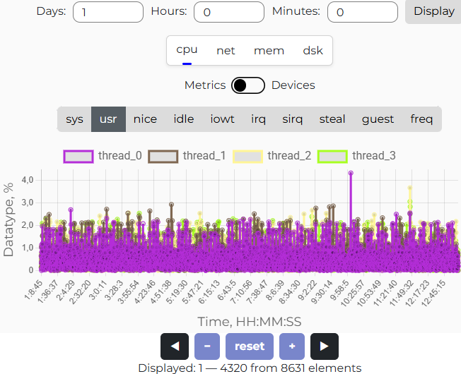 Рисунок 10. Мониторинг нагрузки CPU (usr) счётного узла, режим «Intraday», система StarLIT, вид: график, диапазон 1 ч, разработка рабочей группы HybriLIT.
