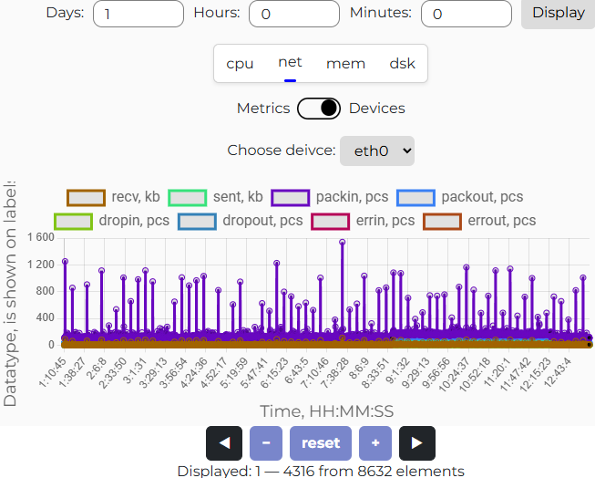 Рисунок 11. Мониторинг нагрузки NET (eth0) счётного узла, режим «Intraday», система StarLIT, вид: график, диапазон 24 ч, разработка рабочей группы HybriLIT.