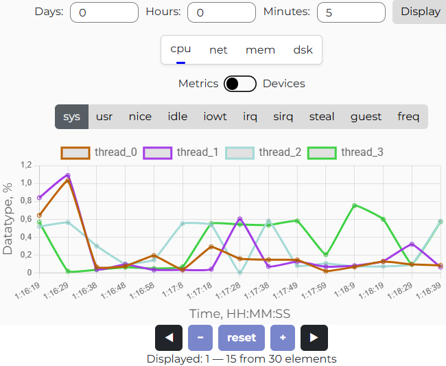 Рисунок 9. Мониторинг нагрузки CPU (sys) счётного узла, режим «Intraday», система StarLIT, вид: график, диапазон 5 мин, разработка рабочей группы HybriLIT.