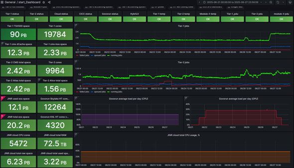 - Мониторинг МИВК суперкомпьютера «Говорун» (ЛИТ, [2]). Для контроля за текущим состоянием счётных очередей суперкомпьютера «Говорун» и количеством выполняемых задач применяется мониторинг ресурсов МИВК, построенный на основе системы GRAFANA и использующий актуальные данные от менеджера ресурсов SLURM (Рис. 3-4).