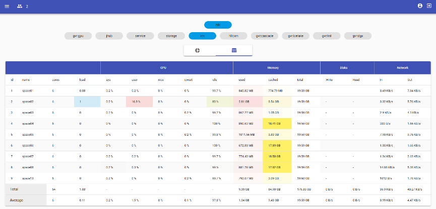 Рисунок 5. Система мониторинга суммарной нагрузки на ресурсы платформы HybriLIT, система SALSA, вид: таблица, разработка рабочей группы HybriLIT.