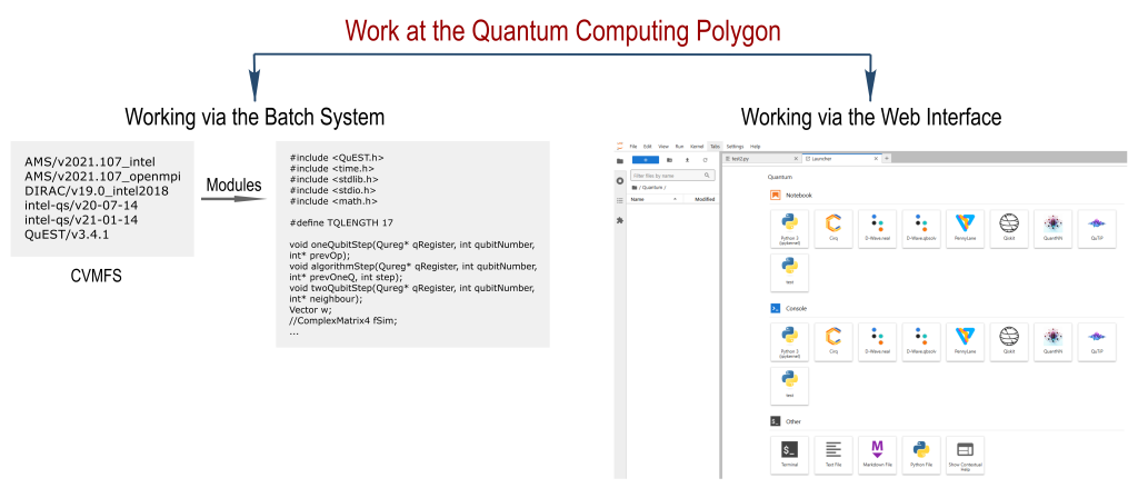 The web interface is based on JupyterLab, the multi-user version of Jupyter. Quantum simulators are available as separate modules. When a simulator is selected, a Jupyter Notebook is launched with the appropriate libraries and environment variables pre-configured.
