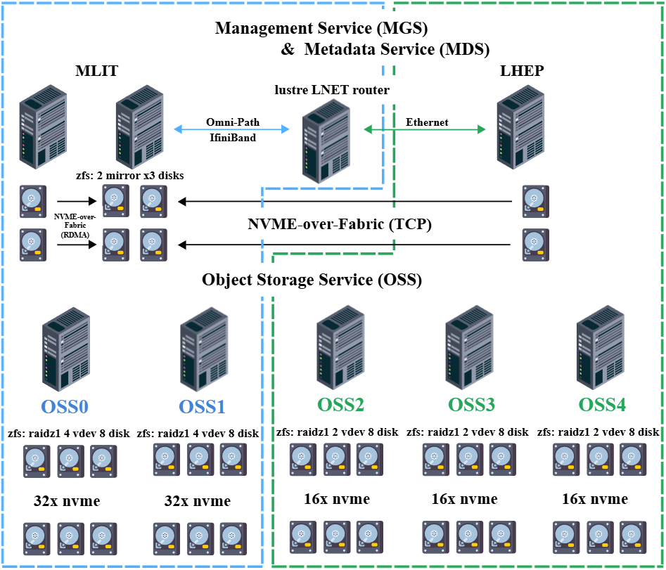 Для реализации проекта по внедрению и конфигурации распределенной файловой системы Lustre между двумя кластерами ОИЯИ, расположенными в ЛИТ и ЛФВЭ[2], с каждой из площадок были предоставлены выделенные серверные ресурсы. На этих вычислительных мощностях была создана распределенная параллельная файловая система Lustre. Архитектура Lustre[3], основанная на принципе распределенности, гарантирует повышенную доступность и устойчивость к отказам, используя программный пакет Pacemaker/Corosync[5]. Это обеспечивает непрерывность работы системы даже при неисправности одного из элементов, благодаря задействованию резервных компонентов.