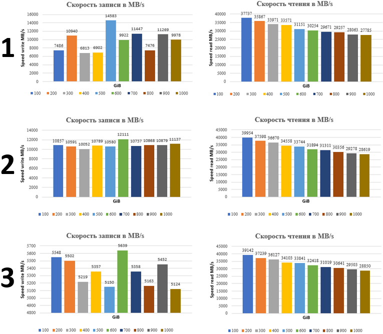 Тестирование проводилось в три этапа инструментарием IOR который использует программный пакет OpenMPI.
